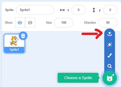 Untuk mengupload sprite milik kita sendiri, caranya masih sama. Yaitu klik menu berbentuk lingkaran dengan logo kepala kucing di pojok kanan bawah pada Panel Sprite. Kemudian klik tombol unggah.